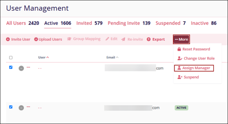 The Assign Manager option allows Admin users to map learner users to their respective manager users. This option is available for all users in the system.