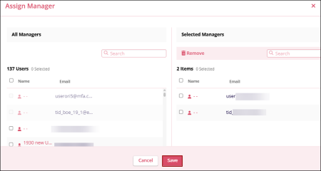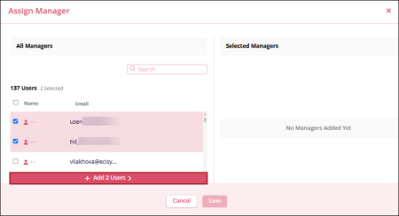 - On the Assign Manager window, select one or multiple users and click on the