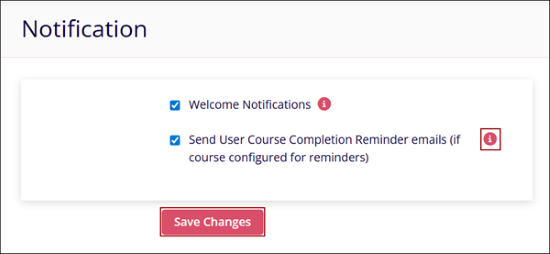 Click on Notification Settings, to access the Notifications page that allows enabling or disabling the welcome notifications and course completion reminders. Click on the checkbox to enable or disable the notification trigger and select Save Changes. Click on the (?) icon to view a tooltip with a description of the particular notification.