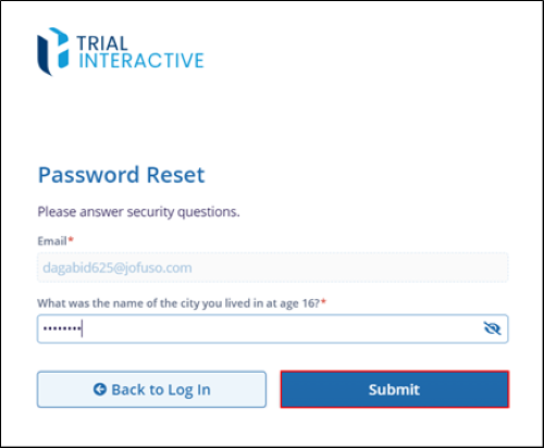 - On the Password Reset screen, enter the answer to the security question and click on
