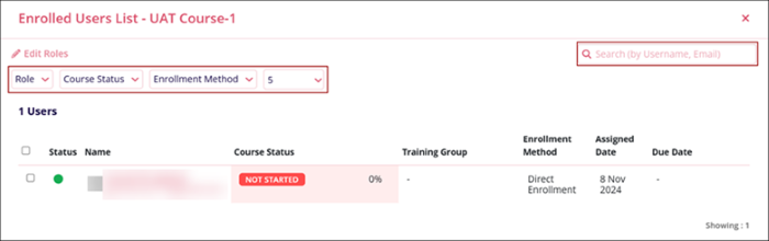 - Click on the Role, Course Status, or Enrollment Method filter dropdown to filter records.