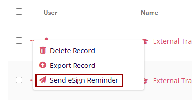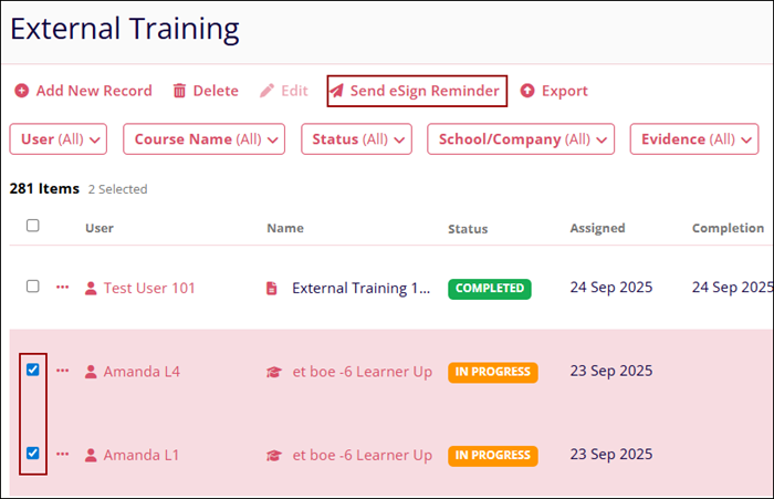 - To send eSign Reminder for multiple users, select users where the training status is In