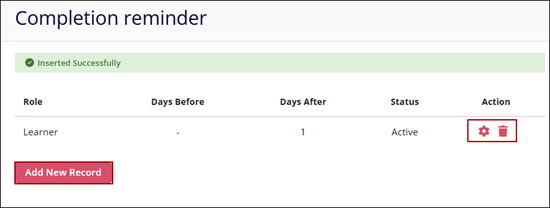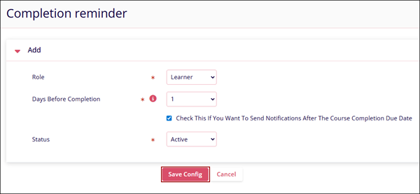 - Days Before Completion*: Set the number of days, and the learner user will receive a reminder before days configured before the due date.