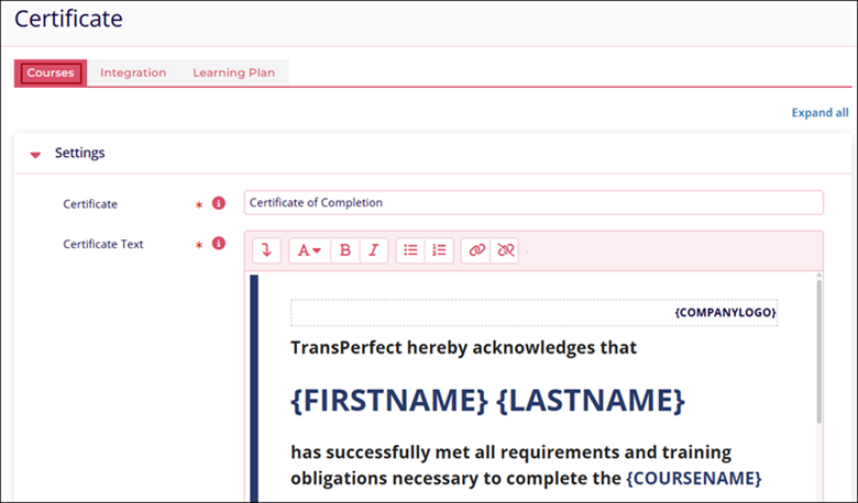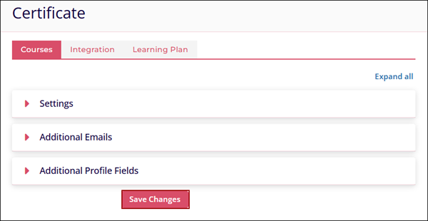 The Courses tab allows users to customize a certificate for individual courses. Once learners complete a course, the certificate they receive will be dependent on the customizations made in the Settings tab.