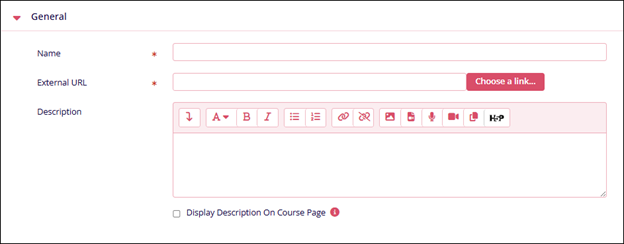 General Name Description. Name* Enter a suitable name for the URL. External URL* Enter the URL link or click on the Choose a link button Display description on course page Enable this setting to view the URL description on the Course Page and vice versa.