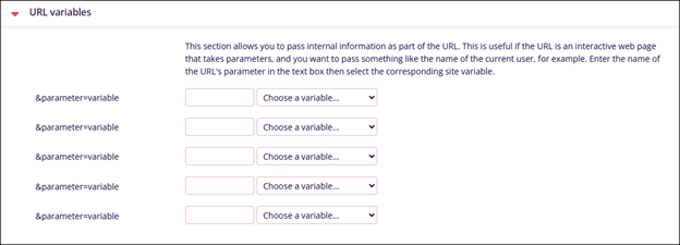 URL variables Name Description. ¶meter=variable Enter the URL parameter in the text box and choose a corresponding site variable from the available dropdown option.