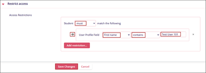 Result: The course section will display a message stating that the course will be unavailable to users whose name does not contain the word ‘test user 101’. This means all users not having the words ‘test user 101’ in their first name can access this course.