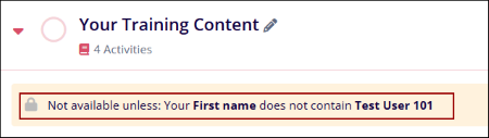 Result: The course section will display a message stating that the course won’t be available for users unless the test word is in their first name.