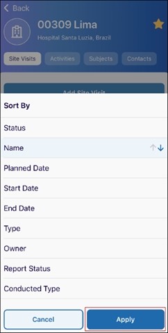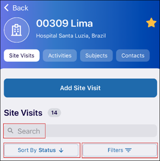 Users can customize the Site Visit screen by applying filters, sorting criteria, and searching for a specific site visit.