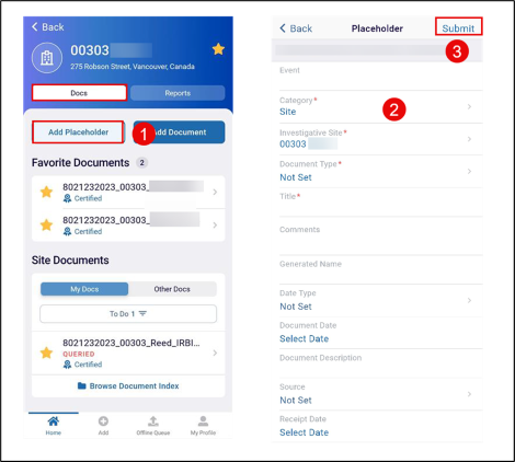 - A notification ‘Placeholder is Uploaded’ is displayed and the document is visible under the Site Documents tab.
