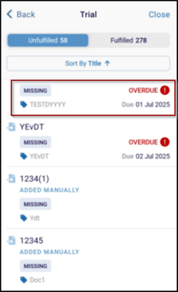 - Missing - Unfulfilled Placeholder and includes an upload call-to-action. If Missing document is past its due date, an Overdue label appears alongside a red warning icon for immediate visibility.