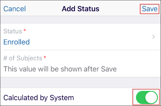 - On the Add Status page, optionally enable the Calculate by System toggle button. If the toggle button is turned off, the user has to manually enter the site’s enrollment statistics for the site at the time of the site visit.