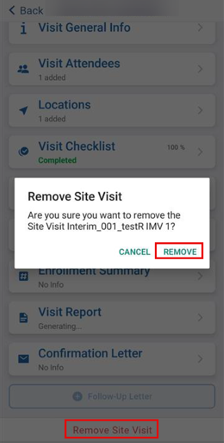 - On the Site Visit Information screen, click on the Remove Site Visit button.