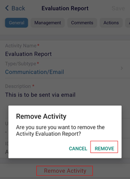 - Confirm the deletion by clicking on the Remove button on the Remove Activity confirmation popup.