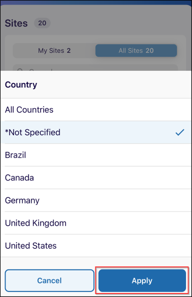 - Select a country and click on the Apply button.