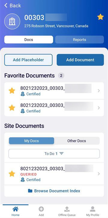 To access a site, click on the Sites tab and select a site by toggling between the My Sites and All Sites tab. The site displays the address along with options to add documents and place holders, view favorite documents, site documents, and browse document index tabs.