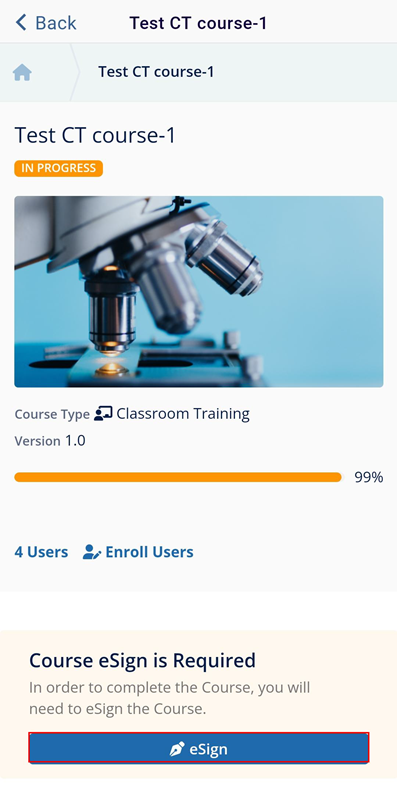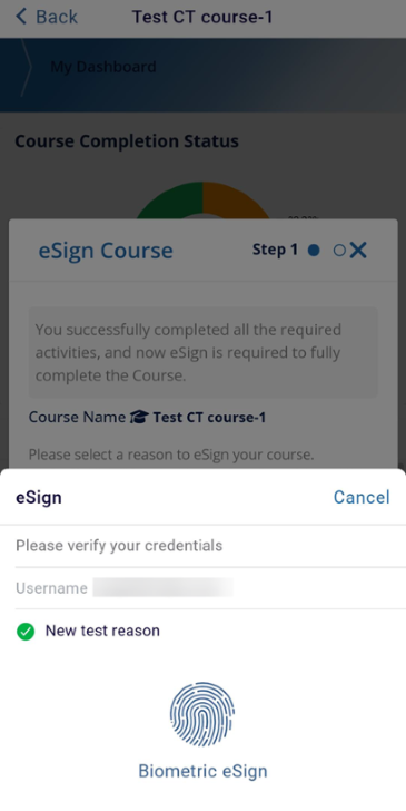- On the eSign Course popup, mandatorily add a signing reason by accessing the dropdown