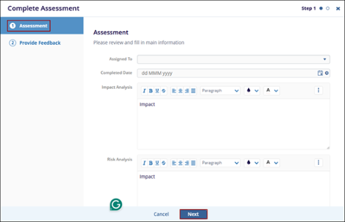 - Click on the Complete button, fill in the necessary details in the Assessment