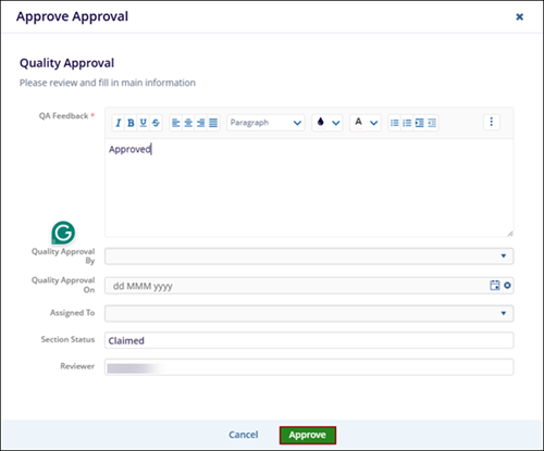 When a Quality Event record enters the approval workflow, the designated authorities are responsible for advancing the record through each stage until it reaches the final stage. At the final stage, a user (typically an Approver) reviews, approves, and closes the record.