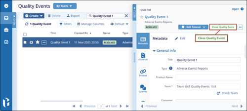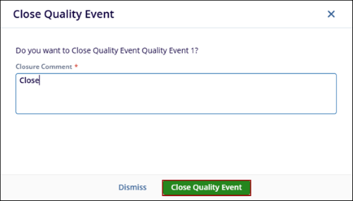 - Mandatorily enter a closure comment on the Close Quality Event pop-up and click on