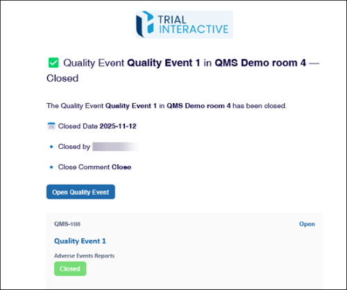 - As the assigned authority in the last stage, access the Quality Event record through the email notification or the My Assignments view.