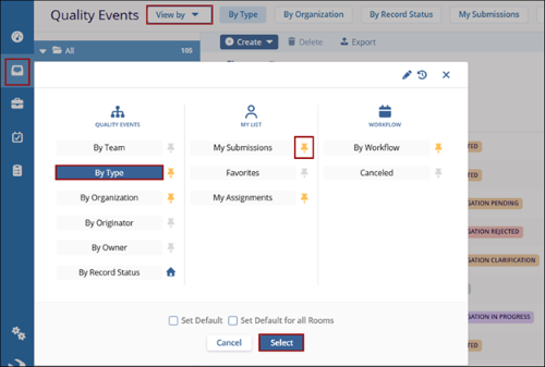 - Select the Quality Events tab from the left-hand navigation pane and click the View By dropdown.
