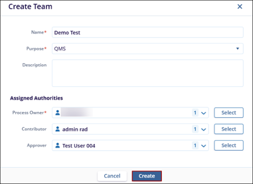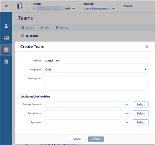 - Click the Create option on the top menu bar. The Create Team pop-up window is displayed.