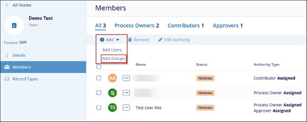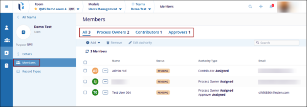The Members page displays a list of users linked to the team, along with options to Add, Remove, or Edit their authority roles. It also includes tabs showing the count of users in each team and provides a Search function for easy user lookup.
