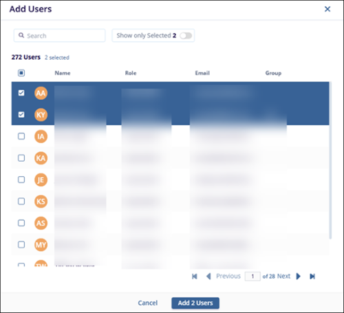 - Click the Add Users option, and the Add Users pop-up window is displayed with the list of users.