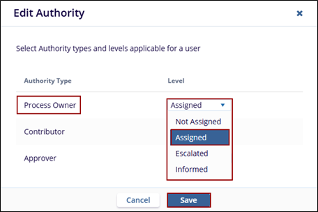 - The Edit Authority pop-up window is displayed with the Authority Types and Level