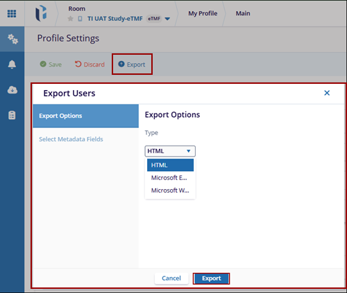 Click Export to export the Profile Settings page. The Export Users page is displayed, where users can select the type of the export and click the Export button.