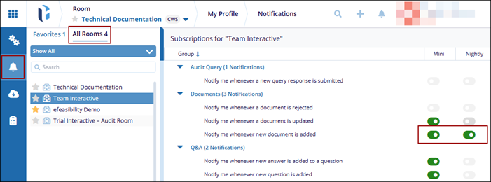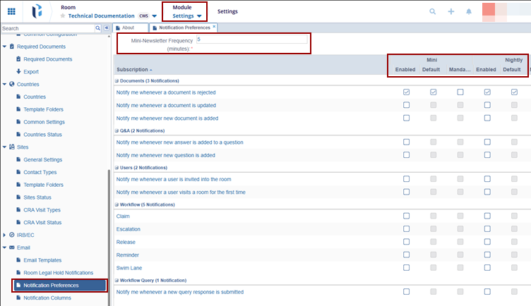 The Notifications section allows users to choose which email notifications they want to receive for their account, based on the rooms the user have access to.
