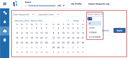- The Export Requests Log page displays the Date Requested, Expiration Date, and Room