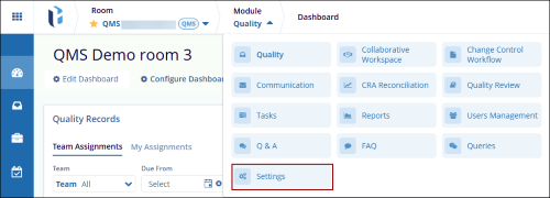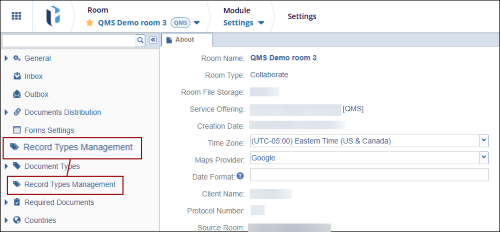 The Record Type Management in the Room Settings allows Admin users to enable the creation, management, and configuration of record types. The Record Types Management settings page displays a structured interface to manage record types and their associated forms, workflows, and field settings. Record types are displayed in a tree structure, categorized by pre-defined categories based on forms with the main topic type.