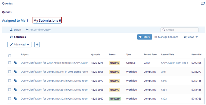 - My Submissions: This tab displays queries created by the current user.