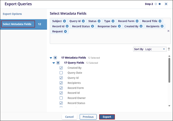 - In Step 2, select the required metadata fields and click Export.