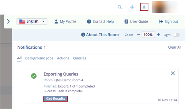 - Click the notifications (bell) icon and click ‘Get Results’ within the success message.