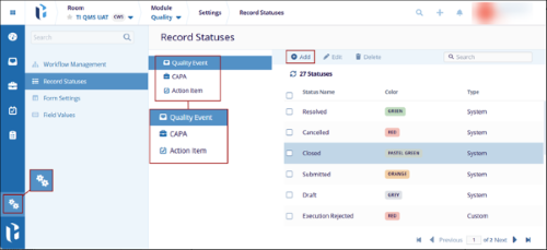 - Select either Quality Event, CAPA, or Action Item to add record statuses to the respective forms.