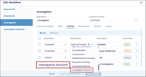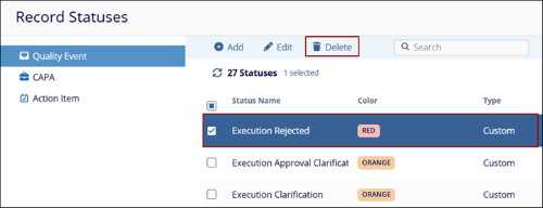 The Record Statuses tab allows Admin users to manage a list of statuses used in QMS workflows by adding, editing, or deleting the record statuses as needed. After configuring the record statuses in this section, the Record Status dropdown in the Workflow Creation wizard will display the available options.