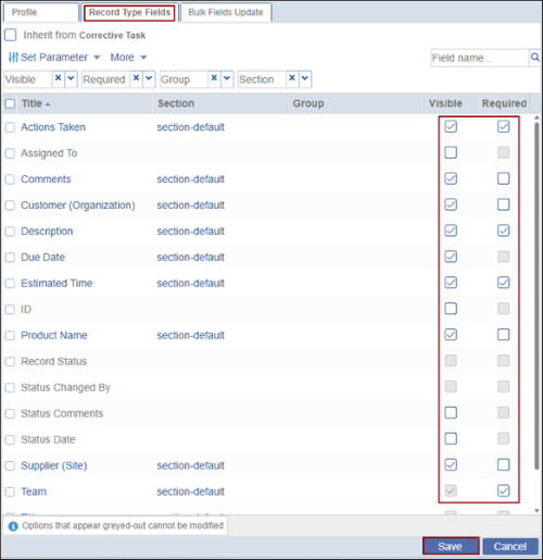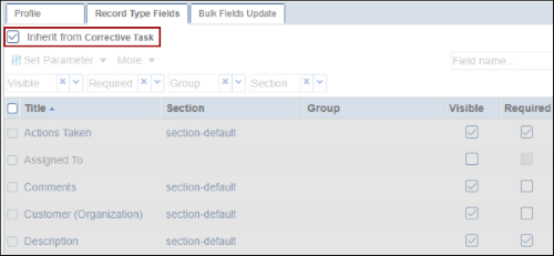 Note: If the Inherit from (parent record) checkbox is checked, the record type will inherit the same configurations of its parent record. - Check or uncheck the Required and Visible checkboxes to determine whether the field