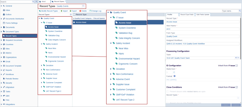 The Record Types page displays the Record types organized in a hierarchical tree structure, where the top level represents form types such as ‘Quality Events’ or ‘CAPA’. These top-level form types are based on forms designated as ‘main topic’ within the Form Settings. Categories beneath each form type are automatically mapped to their corresponding form. The system includes Form (Entity) Type Management, where the available form types are hardcoded and cannot be added or removed through the user interface. However, users can rename these forms via the Form Management section. Under Type and Subtype Management, users can add, edit, or delete record types and subtypes within each category. Each record type is automatically linked to the same form associated with its parent category.