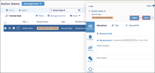 - As the assigned authority in the Implementation Approval stage, open the Action Item