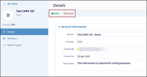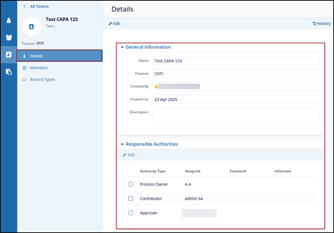 - The Teams Details page displays the General Information and, Responsible Authorities