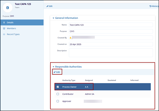 - Check the check box of the associated Responsible Authority while creating the Teams. The Edit button gets enabled.