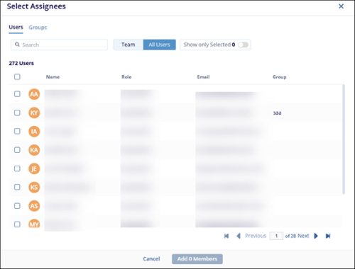 - The Select Users pop-up window displays two tabs: Team Members and All Users. By