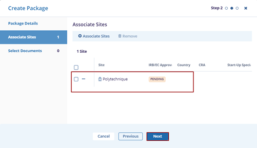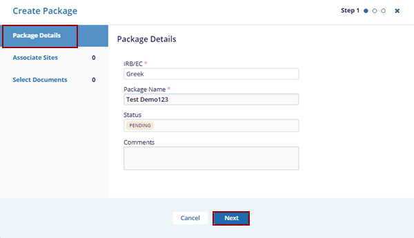 - In the Package Details tab, fill in the required fields – IRB/EC, and Package Name
