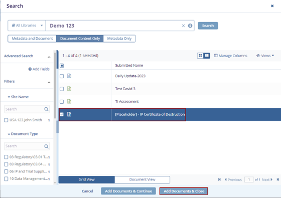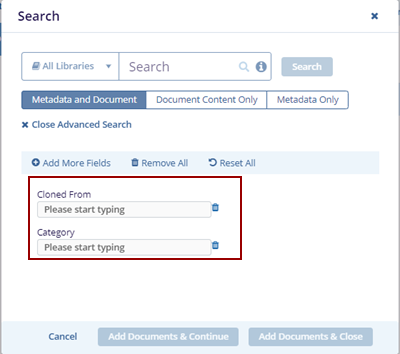 Note: The Metadata and Document tab is pre-selected by default. Choose Document Content Only or Metadata Only if you want to filter the results accordingly.