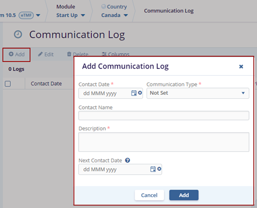 1. Click the Add button displayed on the top menu bar. The Add Communication Log pop-up window is displayed.