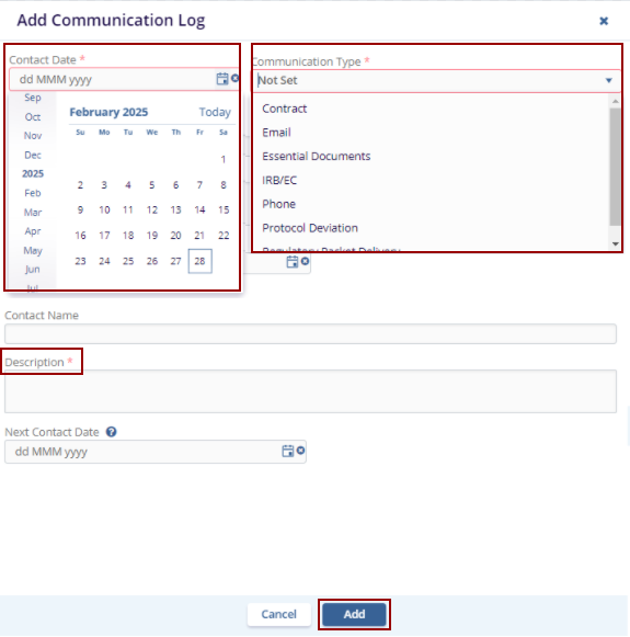 2. Fill in all the required fields, such as the Contact Date by clicking the Calendar Icon and Communication Type by clicking its dropdown menu.
