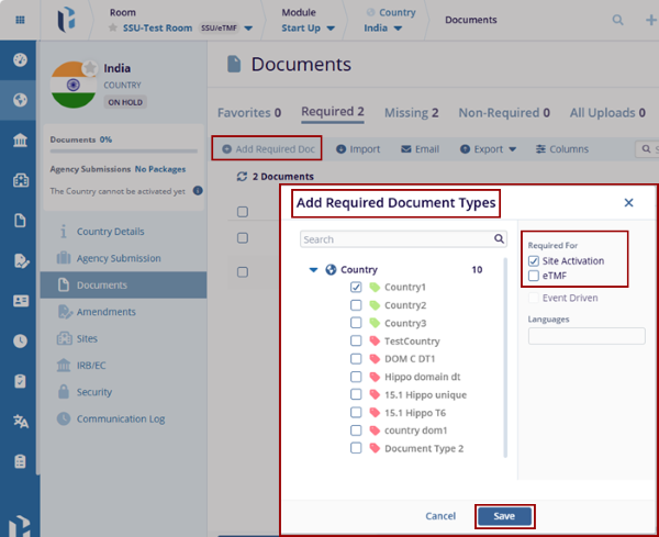 - Expand the Country, and the list of countries is displayed. Select the required Country, check the Site Activation checkbox on the right side of the pop-up window, and click Save.